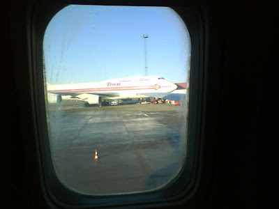 Här bredvid står en 747 från Thai. Fem min t avgång.