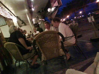 Jag tror jag har lurat ut det nu. Ön bredvid är Cebu, vars huvudstad med samma namn är en betydande turist-hotspot för de fegisar som vill undvika kaoset i Manilla. Gissningsvis tar sig de som vill se nåt annat än Cebu hit till Dumaguete och ställer till det här istället. Här bredvid sitter nu ett högljutt gäng fransmän till exempel, som jag plåtar i smyg medan jag väntar på min kyckling.