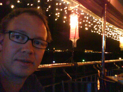 Jag har gått till Harbor View, en restaurang nere vid floden. Här bakom lyser Manilla och strandpromenaden i marsmörkret och jag ska beställa en tresätters med fisksoppa, nån sorts stek och en variant av crepes med mango och glass (se bild). Samt bira. Ett snabbt överslag ger: ca 200 skr.