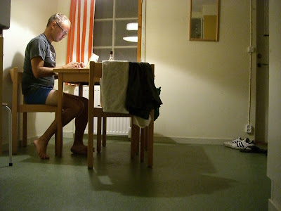 Det blev värdshuset trots allt. Klockan är nu tio över elva och jag kom just åter till stugan – dyngsur om jeansen. Men det gör mig inget. Och min regnhatt som jag gjorde av en Åhlénspåse fungerar över förväntan (på allmän begäran publicerar jag här ett foto av den). Regnet öser ner. Det har hållit på sedan 18-tiden. Därtill blåser det, så regnet kommer från sidan. Man kan inte undvika att tycka att det blir lite mysigt, trots allt, i varje fall sedan man kommit in i den varma stugan och öppnat en liten – alltför liten – flaska rödvin man införskaffat på båten.