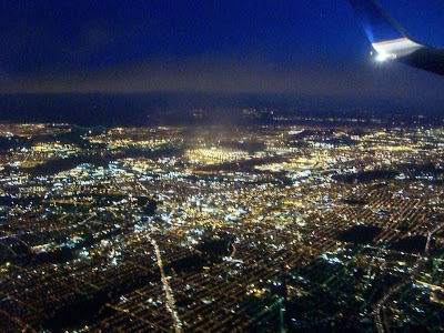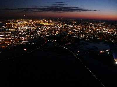 New York by night. Planet har just lyft från Newark norrut, klockan är ca 18 lokal tid, och gör en kraftig babordsgir för att vända söderut mot Mexico. Närmast kameran är troligen snarare New Jersey, med Manhattan långt där bortom.