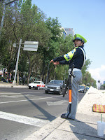 Det känns som det är varmare idag, hetare liksom, eller så är det mer avgaser i luften. Poliser står i varannan korsning och dirigerar trafiken med visselpipa och adderar till kaoset. Här en kvinnlig trafikpolis med batong och allt.