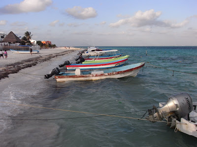 PUERTO MORELOS. Bor fantastiskt fint vid stranden vid den lilla ”fiskebyn”, som det står i guideboken, Puerto Morelos två-tre mil söder om Cancun. Azurblått vatten nedanför. Fiskarna har nog mestadels börjat köra turister på snorklings- och dykturer ut till revet någon sjömil utanför. Nu tar jag en öl här i väntan på att The English Bookshop ska öppna för kvällen (!) vid byns centrum, en gatukorsning med en lekplats bredvid. Här är rätt gott om turister, det är enda nackdelen. Två nätter här, sen ner till Tulum. Exakt hur rutten ser ut de närmaste dagarna är icke spikad.