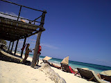 Här i Tulum är det andra blåsiga kvällen i rad. Vi har just käkat en rask middag och dragit ett par Corona, jag tog en sallad, Alex ett par burrito. Det blåser vad som känns som kuling in från en kolsvart Atlanten. Fast inte helt svart, det är halvmåne och ett svagt, kallt ljus lyser upp stigarna mellan hyddorna på båda sidorna om baren och restaurangen. Ett femtontal personer sitter vid baren och restaurangen och småpratar tyst till tonerna av en dj som sitter vid baren och spisar plattor från sin iMac. Low key-stämning. Rätt mysigt på det hela taget. Se filmen, som visar restaurangborden och baren i nattmörkret (om den nu kommer med).