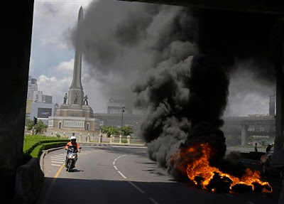 Flera rapporter tyder på att mililtär och polis än så länge agerat rätt lamt mot demonstranter, som å sin sida bränt en buss och slagit sönder andra fordon och försökt inta regeringsbyggnaden i Bangkok. Oro finns nu för en splittring inom militären där den del som stöder de rödklädda anhängarna till förra premiärministern Thaksin vänder sig mot den falang som vill låta den nuvarande regeringen sitta kvar. Isåfall hotar inbördeskrig i Thailand.
