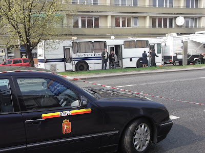 Ett filmteam som parkerat sina bussar här på gatan har just avslutat en inspelning inne i en kyrka, precis här bakom. Utanför står en nunna – eller en skådis utklädd till nunna – och pratar i mobiltelefon.