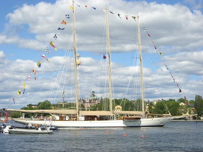 Den här segelskutan, såvitt jag kan få fram skonaren Adix med hemmahamn London, ligger förtöjd med aktern inåt Skeppsbron. Mycket vackrare blir det inte.