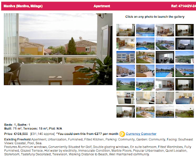 Ett exempel på prisbilden är kanske den här lägenheten på 71 kvadratmeter med pool och havsutsikt i Manilva mellan Valencia och Gibraltar (se kartan). Utbudspriset ligger på 108 500 euro, alltså cirka 1 miljon kronor. Jämförelsen haltar visserligen en hel del, men min egen lägenhet i Stockholm – mindre, utan pool & beach – är för tillfället värderad till 2,5 miljoner.