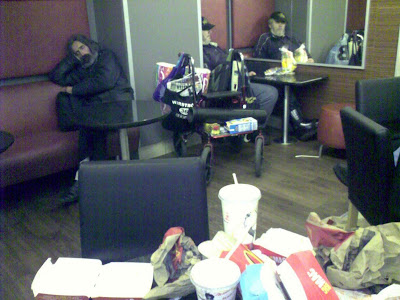 Här på McDonald’s vid Sveavägen i centrala Stockholm har två till synes bostadsläsa hittat sitt tillfälliga uppehälle. De sitter inkrupna längst in i snabbmatrestaurangen, till synes omedvetna om musiken, stöket, sorlet och tiden – några timmars sömn innan stället stänger. Eller, ifall det är öppet dygnet runt, ska städas.