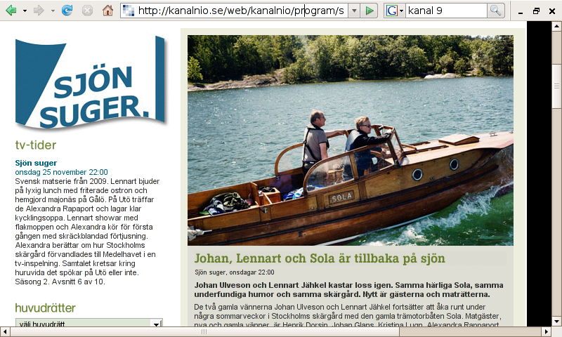 i skärgårn – med snaps tillDet här är ett av mina favoritprogram på söndagar just nu: Matprogrammet Sjön suger med Lennart Jähkel och Johan Ulveson, där de är ute på en ö i skärgårn bland sjöbodar, snaps, bastu och den gamla gistna Petterssonbåten Sola och lagar mat. De svär, snapsar, struntar i recepten och står i. De bjuder också in en gäst varje gång, idag var det komikern André Wickström,
