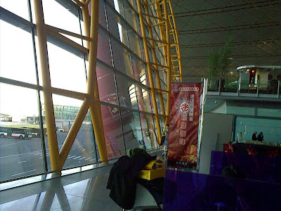 PEKING. Sitter med en kaffekopp framför mig med den här utsikten och väntar på en omelett. Klockan är kvart i elva lokal tid i Peking. En mycket konstig känsla på den gigantiska nya flygplatsen: minutiöst rent, lite människor, amerikanska christmas carols i högtalarna (Silent Night, följd av Jingle Bells precis nu) och servitriser som ser ut att vara elva år, klädda i tomtekostym. Om nån kommit fram och sagt ’Welcome to New York’ eller ’Chicago’ hade jag gått på det om det inte varit för alla Air China-plan utanför på plattan.