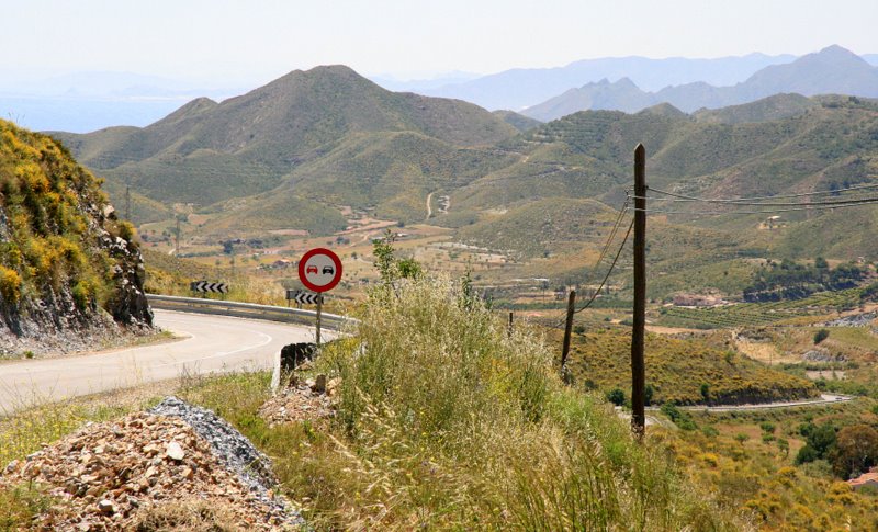 Sedan morgonens dopp har jag förflyttat mig 20-talet mil söderut, fast först efter att ha snurrat runt och kollat in en hel del småstäder och byar, en helt övergiven by som låsts igen av myndigheterna (se bild nedan), och en del tjusiga kuststräckor. Norrifrån, de sista sex-sju milen fram till en stad som heter Vera körde jag en betalmotorväg som hade lett mig ner till Alméria om jag fortsatt. Jag svängde dock av vid Vera eftersom jag ville kolla in ställena längs kusten. Ett av dem, Garrucha, är där jag nu är och stannar för natten. Imorgon fortsätter jag några mil västerut längs kusten innan jag svänger norr ut till Clintans västernstad strax norr om Alméria, och därefter tar en nordligare rutt norr om Sierra Nevada-bergen riktning mot Granada. Hittills har rutten hållit väldigt bra, jag är nöjd med planeringen.