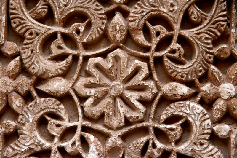 Bilden över och under: detalj från en vägg, utkarvat i sten.