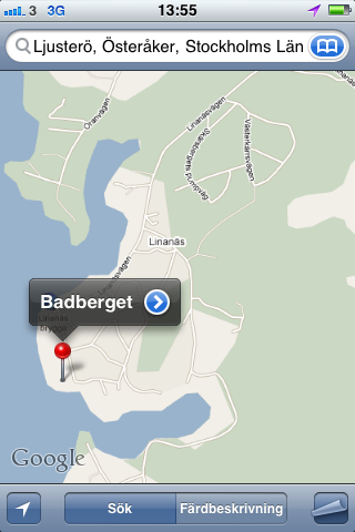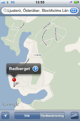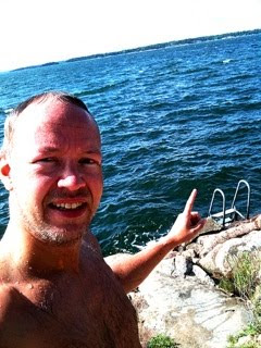 Men bada går som sagt. När du går av båten kliver du rakt över vändplanen med ett träd mitt på och fortsätter in på en liten väg rakt fram, lite svår att se först. När du passerat några hustomter till höger kommer du till en skylt, ”Badberget”, och en stig till höger. Den leder till ett, just det, berg som man kan bada ifrån. Det finns till och med stege, lite fjompigt men bra att ha när brisen ligger på och ger en hel del vågor som den gjorde idag.