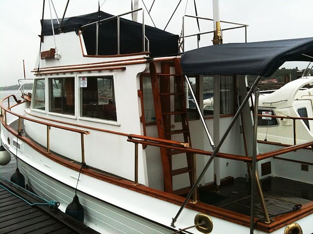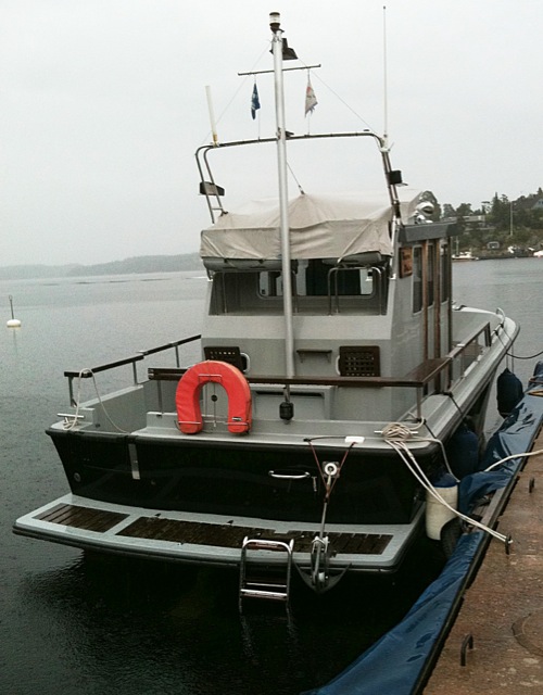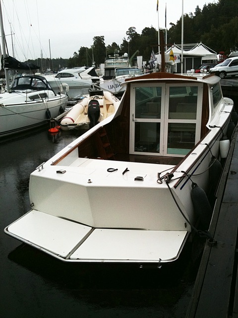 En tjusig Grand Banks 32 Sedan från 1974 med en Ford-diesel under däck. Såg ut att ha bra finish i detaljerna inuti och med rejält tilltaget akterdäck. Lite synd dock att den här modellen inte har sidodörrar in till styrhytten som en del andra Grand Banks. Det här är framför allt en flytande sommarstuga, relativt billig i inköp men man kan gissa att den kostar en del i underhåll.