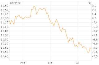 Det finns goda skäl, inte minst ekonomiska: pundet har sjunkit under hösten och handlas nu kring 10:50, ett tapp på 8-9 procent sedan mitten av augusti (se kurvan). Det gör det billigare än på länge att shoppa i London för en svensk. Dessutom finns billiga flyg i uppsjö, även om flygtiderna inte alltid är de bästa för de allra billigaste biljetterna.