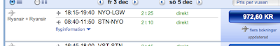 - För den som verkligen vill spara pengar är det de riktiga lågprisbolagen som gäller. Ryanair är svårslaget när det gäller priser, även om man kan säga en hel del om service, flygtider och logistik. Ryan tar dig från Skavsta utanför Nyköping kl 18.15 på fredagen och tillbaka från Stansted (Ryanair flyger även på Londonflygplatsen Gatwick) kl 20.05 på söndag den 5 dec för 1 262 SEK. Men – ännu billigare, fortfarande med Ryanair, blir det när samma biljett bokas som två enkelbiljetter via Skyscanner.se: 973 SEK.