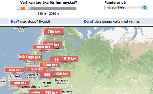 3. Har du inte bestämt resmål? Antag att du bara vill bort från det svenska vinterslasket, no matter where – då är ressajten Kayak.se och dess funktion Explore något för dig. Här väljer du hur mycket din biljett får kosta – och sajten levererar förslag på destinationer (bilden nedan). Exemplariskt för den extremt flexibla resenären.