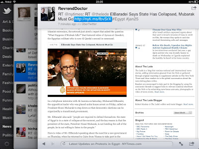 Enligt fredspristagaren ElBaradei, som sattes i husarrest strax efter att han anlänt till Egypten för att delta i protesterna, har den egyptiska staten kollapsat, säger han till Al Jazeea, och det är just nu oklart om det är president Mubarak eller militären som kontrollerar Egypten. Om militären i praktiken styr är presidentens dagar räknade. Han utsåg idag en vice president, den tidigare säkerhetschefen Suleiman, en post som inte existerat i Egypten på decennier.
