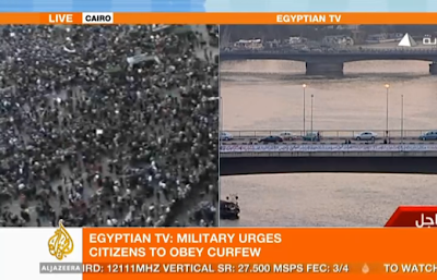 Live-bilder från Al Jazeera, som än så länge fortsätter sända från mitt i Kairo trots att regimen dragit in kanalens tillstånd, visade under söndagseftermiddagen tiotusentals människor, om inte hundratusentals, samlade vid Tahrirtorget mitt i Kairo som blivit protesternas epicentrum. Strax före kl 15 svensk tid flög egyptiskt stridsflyg mycket lågt över torget flera gånger, rimligtvis för att skrämma folket till att lyda beslutet om utegångsförbud från kl 16. Ljudet från planens motorer var ”deafening”, rapporterade kanalens korrespondent, vars namn hålls hemligt av säkerhetsskäl.