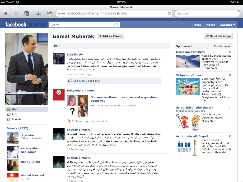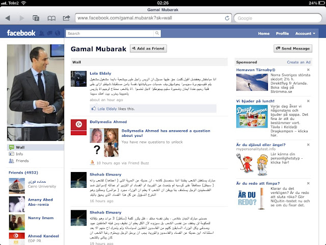 På Gamal Mubaraks Facebooksida skriver en anhängare och frågar var Gamal befinner sig och uppmanar honom att ta makten i Egypten när pappans tid nu börjar rinna ut. Men enligt en uppgift flydde Gamal och hans familj i slutet av veckan ihop med ett hundratal resväskor i privatjet till London.