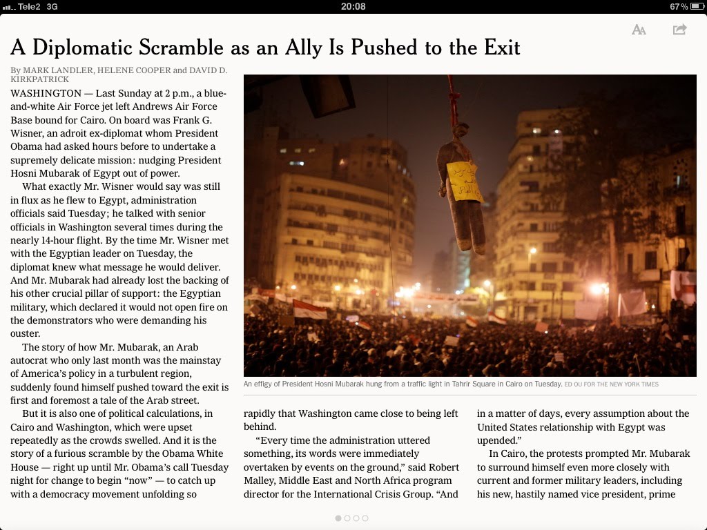 NEW YORK TIMES har storyn alla bör läsa som vill förstå motiven bakom Mubaraks besked att inte ställa upp för omval, USA:s roll och agerande, och hur Washington togs på sängen och tvingade omvärdera hela sin Mellanösternpolitik och stödet till en av sina främsta allierade i regionen på rekordkort tid.