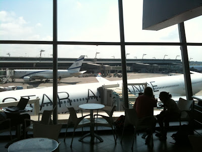 JOHANNESBURG INT. AIRPORT. Jag sov förbi frukosten på flighten från London, så nu har jag beställt in kaffe och yoghurt. Det påstås vara 18 grader varmt så här på måndagsförmiddagen i Johannesburg, själv vet jag inte för jag har bara varit på flygplatsen. På Arlanda fick jag beskdet att jag skulle behöva hämta ut väskan i Johannesburg och ta den själv genom tullen. Men det är fel, gör man en transfer här går man bara till International Transfer Desk, får sitt nya boardingkort och sen genom säk-kontrollen. Väskan sköter sig själv (om den sedan kommer fram är en annan fråga).