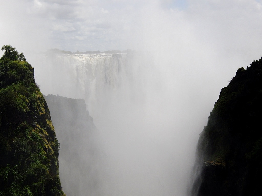 VICTORIAFALLEN, ZAMBIA/ZIMBABWE. Detta är, officiellt, ett av världens sju underverk, Victoriafallen på gränsen mellan Zambia och Zimbabwe. Här, längs Zambesiflodens snirklande väg söderut vid ett två kilometer brett delta befolkat av flodhästar, öppnar sig marken i en lika bred spricka, hundra meter djup, i vilken vattnet kastar sig ner med ett dovt dån. Fallet är knappt två kilometer brett och utan tvekan ett fantastiskt skådespel. Floden försvinner ner i marken den zambiska sidan. På motsatta kanten av den dramatiska förkastningen, i Zimbabwe, finns en park, 30 US-dollar i inträde, varifrån fallet kan beskådas i hela sin bredd.