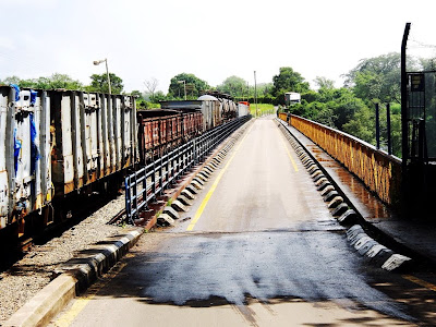 Bron fyller fler funktioner: den är tungt trafikerad av lastbilar, där bara en kan passera åt ett håll åt gången. Bredvid det enda körfältet går tågspåret, med turister hoppande kors och tvärs för att ta bilder. Dessutom, mitt på bron, finns en ställning uppriggad från vilken folk hoppar bungeyjump ner mot flodens virvlande vatten hundratalet met nedanför. Alltihop övervakat av militärliknande vakter med automatvapen.
