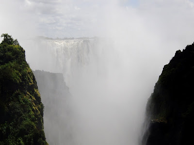 Just nu råder regnperiod och därmed högvatten. Vattenmängden i fallet är nära sin högstanivå nu (jag läste på en informationsskylt att den peakar i april) och luften ovanför sprickan är fylld av vattendroppar. Längs den två kilometer långa promenadvägen där jag gick i dag faller därmed ett konstant duggregn – för att inte säga skyfall stundtals – och allt man bär med sig och har på sig blir totalt genomblött (regnrockar finns att hyra för 3 dollar). Det för också med sig att man faktiskt inte ser så mycket av själva fallet, det är dolt av ett gigantiskt säkert 100 meter högt moln av vattenånga. Dessutom är aktiviteter nedströms, som forsränning, inställda vid den här tiden på året.