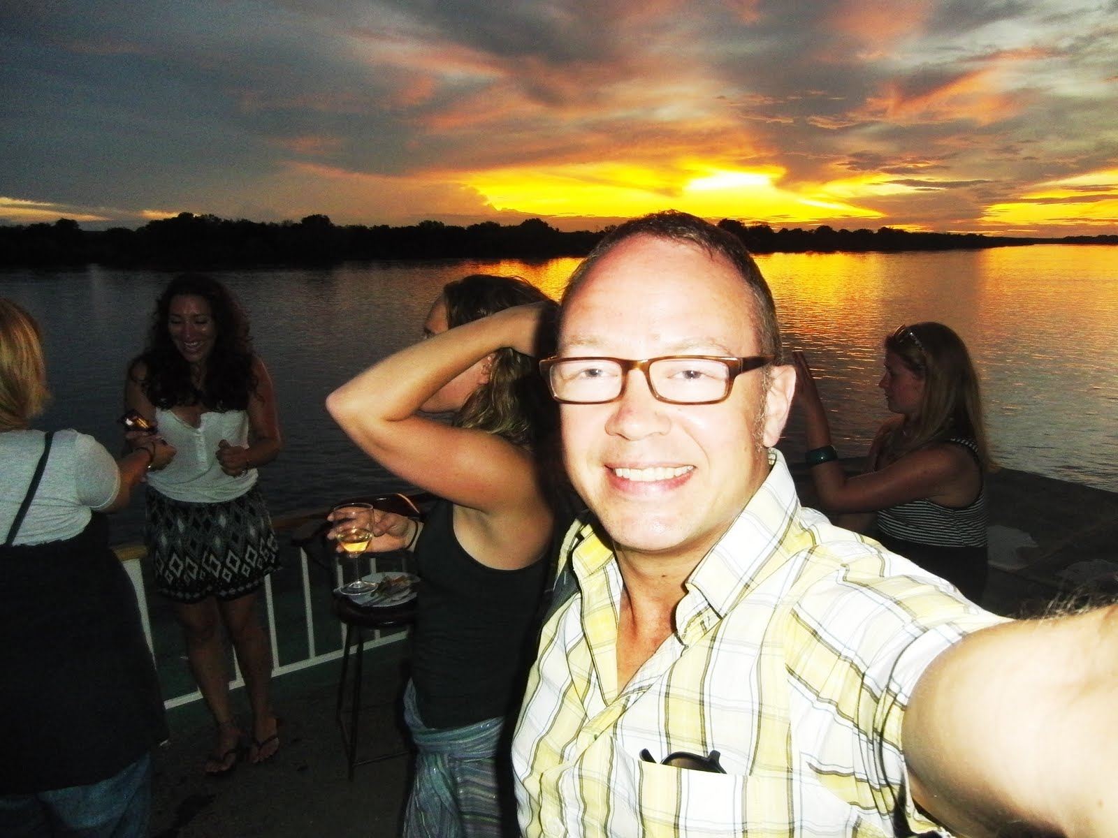 ZAMBEZI RIVER. Har tillbringat eftermiddagen och kvällen på Zambezifloden, ombord på en flodbåt uppströms från Victoriafallet. En utomordentligt trevlig aktivitet. Middag och fri bar hörde till evenemanget, plus ett blandat gäng britter, skottar, sydafrikaner och austaliensare som, åtminstone flertalet av dem, var på väg söderut genom Afrika med en variant av Rosa Bussarna, som tagit många svenskar ut i världen genom åren. Ett glatt gäng på det hela taget.