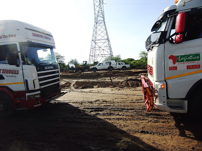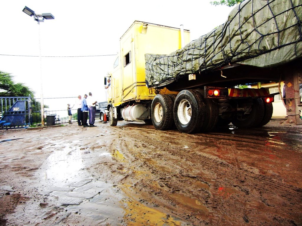 Precis när vi anlänt i motorbåt från zambiska sidan till Bostwanas lika leriga strand, för vidare transport till nationalparken Chobe efter passage genom Botswanas immigrationsmyndighets barrack där vi får passen stämplade, händer det som inte får hända. En dragbil, av en händelse en svensktillverkad Scania, har fått stopp på Botswanasidan. Bilen står i leran, det fullastade släpet står kvar på pråmen. Det ryker från dieselmotorn och ekipaget kommer varken framåt eller bakåt. Hela överfarten är plötsligt låst. Ännu mera kaos.