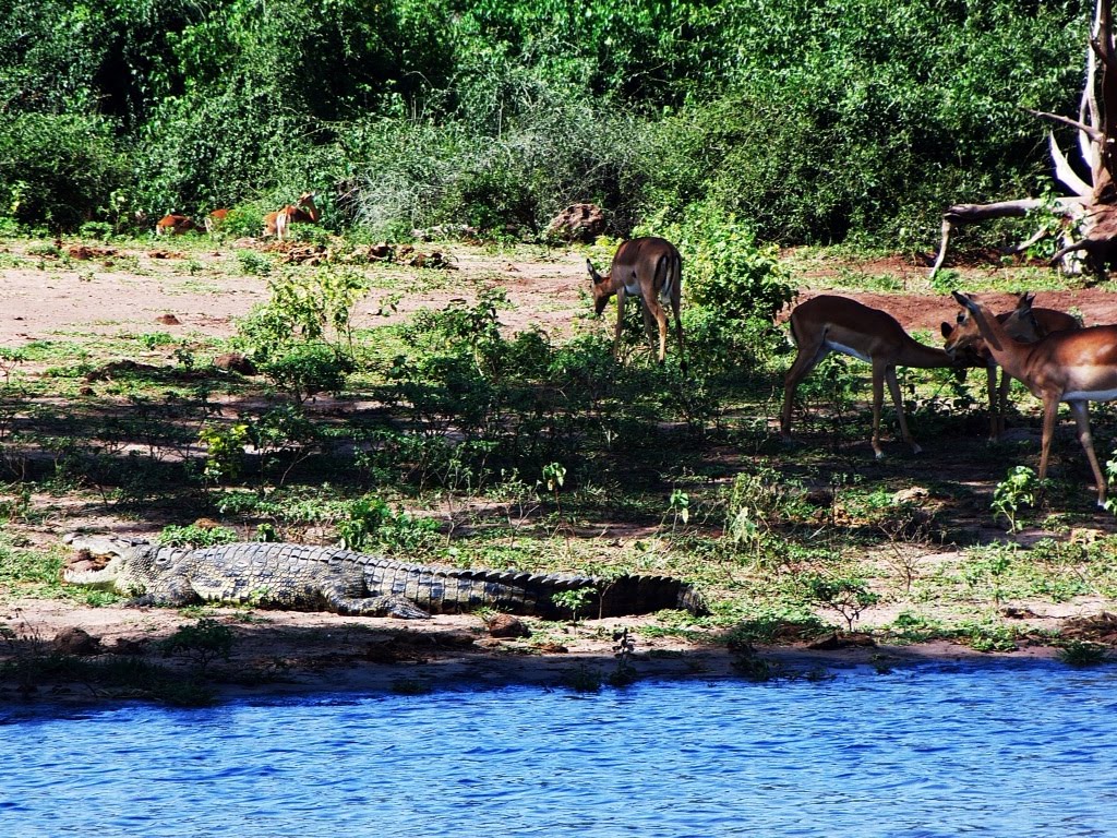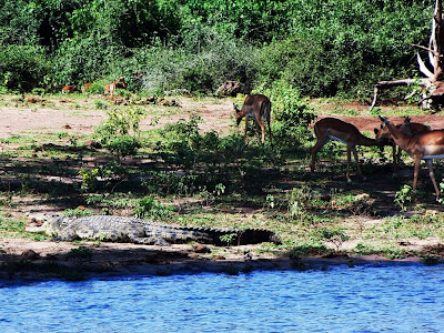 I alla fall, efter denna harang skulle jag berätta om en mycket fin dag i nationalparken Chobe i Botswana. Dagen var uppdelad i två delar: först, den delen jag tyckte bäst om, skjutsades vi (jag, en japansk kille och ett holländskt par) utmed floden Chobe för att spana vilda djur längs stranden. Oerhört lyckat: vi spottade bufflar, flodhästar, krokodiler, elefanter plus de antiloper, Impala, som jag redan sett i överflöd i Etosha, Namibia. Därefter lunch, och sedan en safari i en turistversion av en Toyota Landcruiser (the car of choice i terrängen i de här länderna) då vi såg mer av samma sort. Nu har jag fyllt safarikvoten för några år framöver, känner jag.