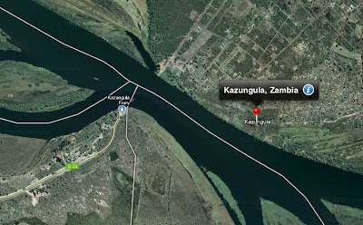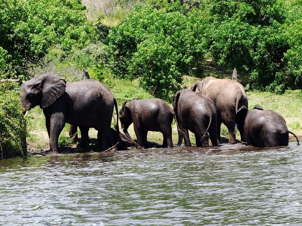 CHOBE NATIONALPARK, BOTSWANA. Kazungula är punkten på kartan, några mil rakt västerut från Livingstone, Zambia, där fyra länder möts, mitt i floden Chobe (biflod till Zambezi): Zambia, Botswana, Namibia och Zimbabwe. Precis där finns ett färjeläge – gränsen är tungt trafikerad av långtradare åt båda håll.