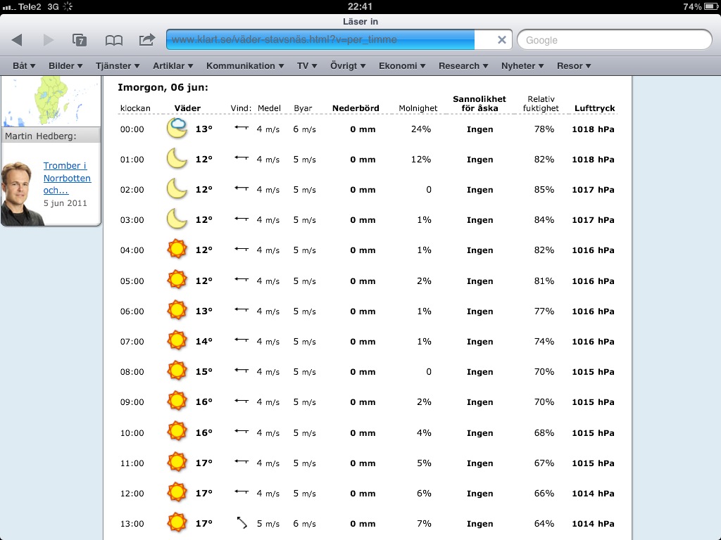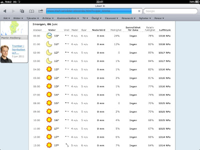I alla fall, imorgon, nationaldagen, hade jag tänkt tillbringa något norrut i Möjaskärgården. Oklart exakt var, men det sägs vara en populär ögrupp för båtfolk att kuska runt i. Skulle vara kul med lite båtgrannar på lagom avstånd. Vi får se hur det blir, jag ska försöka få iväg en rapport. Vädret ska bli bra: uppåt 20 grader, ost 4-5 m/s, mest sol.