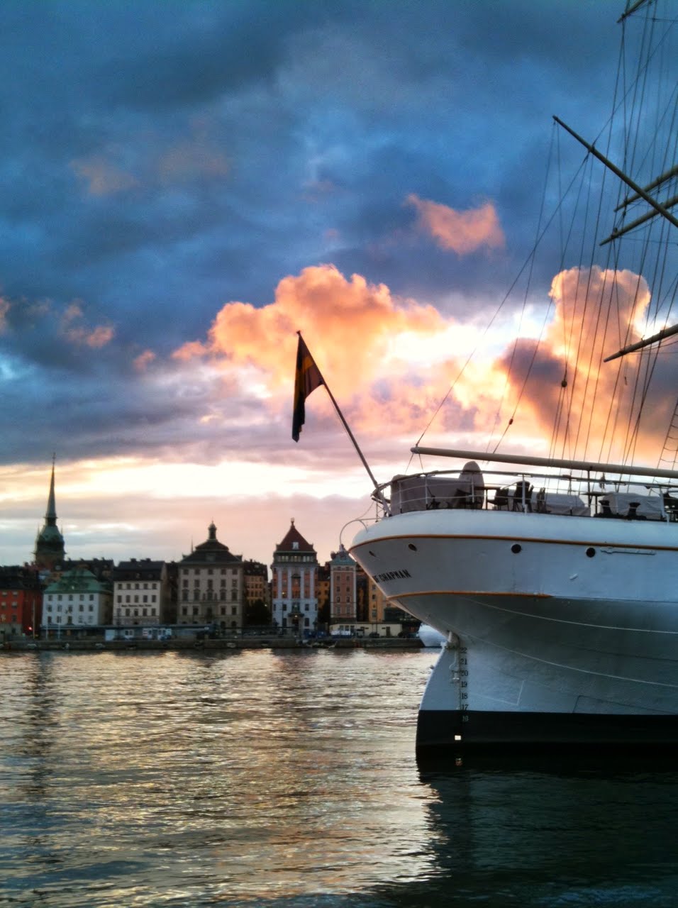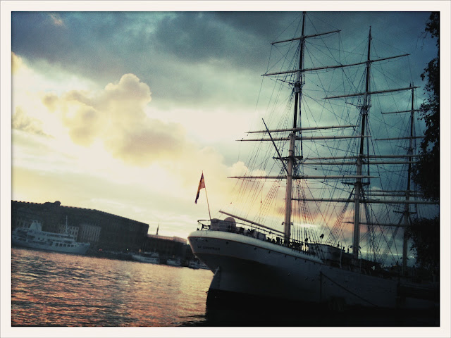 Så här fin kan utsikten från Skeppsholmen vara en tisdagkväll i augusti, fotograferad med en simpel mobilkamera. Jag hade cyklat från jobbet för att se en replika av en gammal hjulångare som låg förtöjd vid Vasavarvet på Djurgårn. Det slutade med en fantastiskt fin tur runt Stockholms kajer och alla dess gamla skutor och skepp. Bland den, så klart, af Chapman, ståtligast av dem alla.