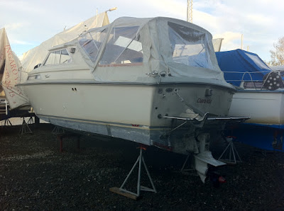 INGARÖ. Här har vi fartyget tryggt upplagd på landbacken i väntan på vårrustningen. Maskinen och den läckande oljeledningen är ännu ej reparerad, men det finns det ju tid till.