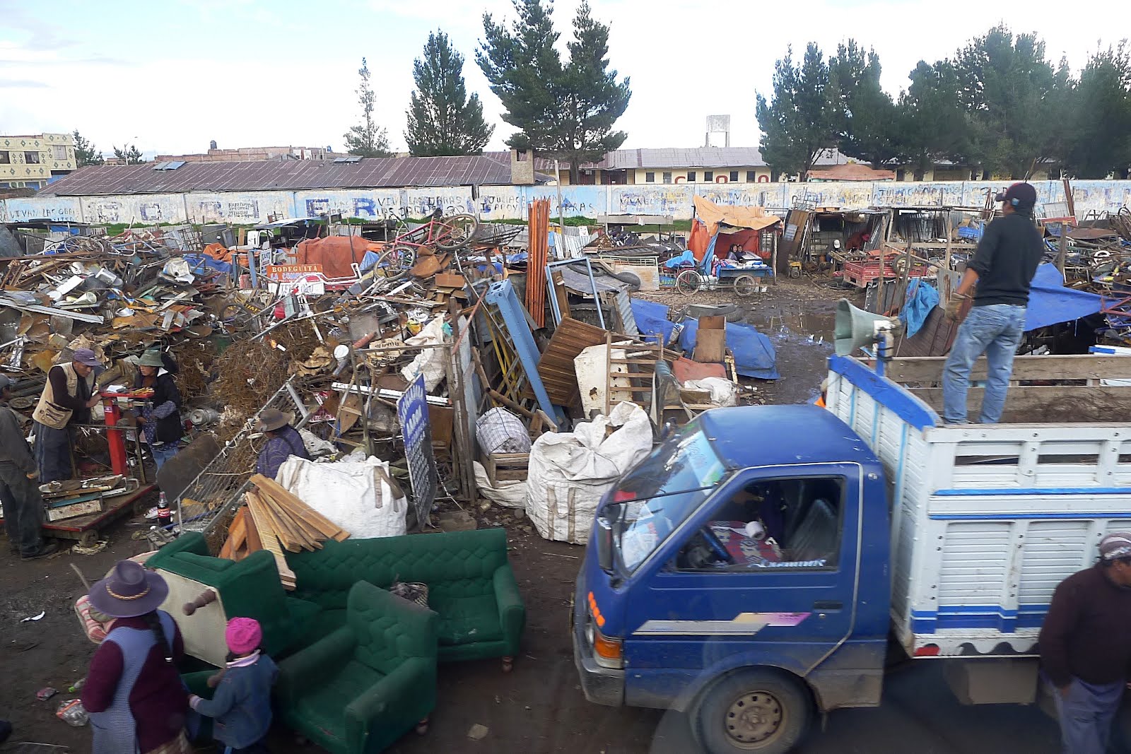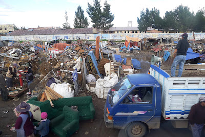 Skälen är flera. Ingenting i Juliaca tycks färdigbyggt. Mer eller mindre vartenda hus man ser i denna relativt stora stad med hundratusen invånare är halvfärdigt. En eller två våningar, med ytterligare en i ofärdigt skick. Dräneringen fungerar inta – överallt breder lervälling ut sig. När vår buss kör in i stans yttre delar är det första vi ser en gruslastbil som lutar snett fastkörd i en leråker. Alla drivhjul snurrar runt förgäves och en grävmaskin bakom försöker skjuta på utan effekt. Tung traik dundrar genom Juliaca och man ser få normala bostadshus, fast men ska väl tillägga att vi bara hunnit se en liten del på vår genomresa.