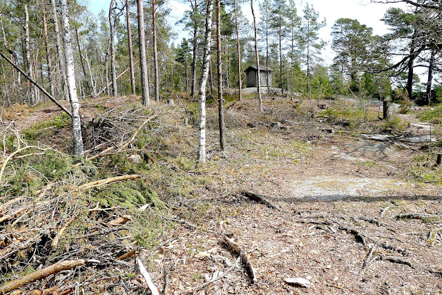 Som många vet hämtade August Strindberg inspirationen till Hemsöborna från Kymmendö, där hans skrivarstuga från sent 1800-tal ännu står kvar. Det gör däremot inte skogen runtikring stugan. En skövling av något slag har ägt rum, antingen hårdhänt gallring eller borttagning av skog som stormfällts. Högar med ris och kvistar ligger kvar och skräpar, medan timret har fraktats bort. Någon mer information än så kunde jag inte inhämta vid helgens besök, men det är sorgligt att den tidigare så täta och fina skogen, där Strindbergs stuga doldes i grenverket, nu är till stora delar försvunnen.