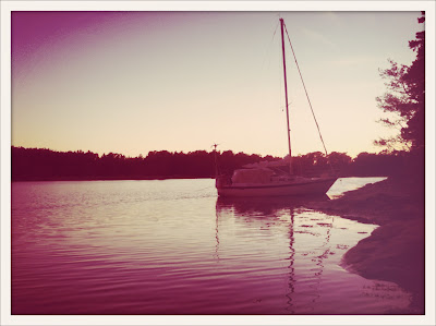 VILDGRYTAN, STOCKHOLMS SKÄRGÅRD. En segelbåt (bilden) la till i eftermiddags. Ombord finns, har jag kommit på genom att lyssna på konversationen i sittbrunnen, ett tjejgäng som är ute på navigationskurs. Läraren/kaptenen mästrade om bäring, avdrift och pålstek förut när jag satt och åt min grillade korv.