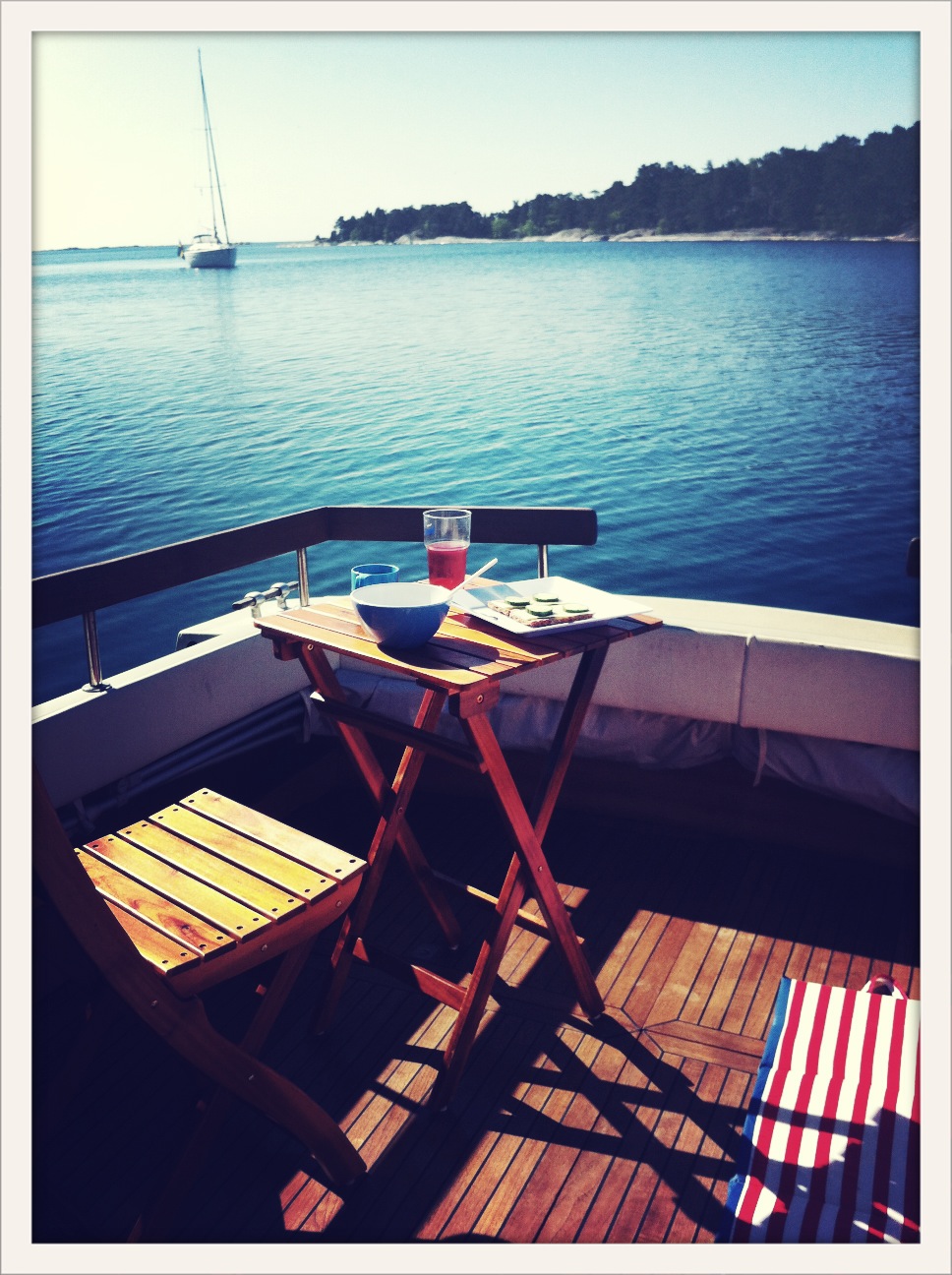 VILDGRYTAN SÖN 27 MAJ. Fantastisk morgon här ute: vindstilla, sol och drygt 20 grader i lä. Vaknade halv åtta och gick ut och la mig i solen på akterdäck. Där var det redan varmt. Här läst tidningen i mobilen, käkat frulle och morgonbadat (11 grader, väsentligt varmare från igår…). Planen är att vara kvar här på förmiddagen, sedan en lunchtur till Sandhamn samtidigt som vinden vänder till syd, då är inte den här platsen bra längre.