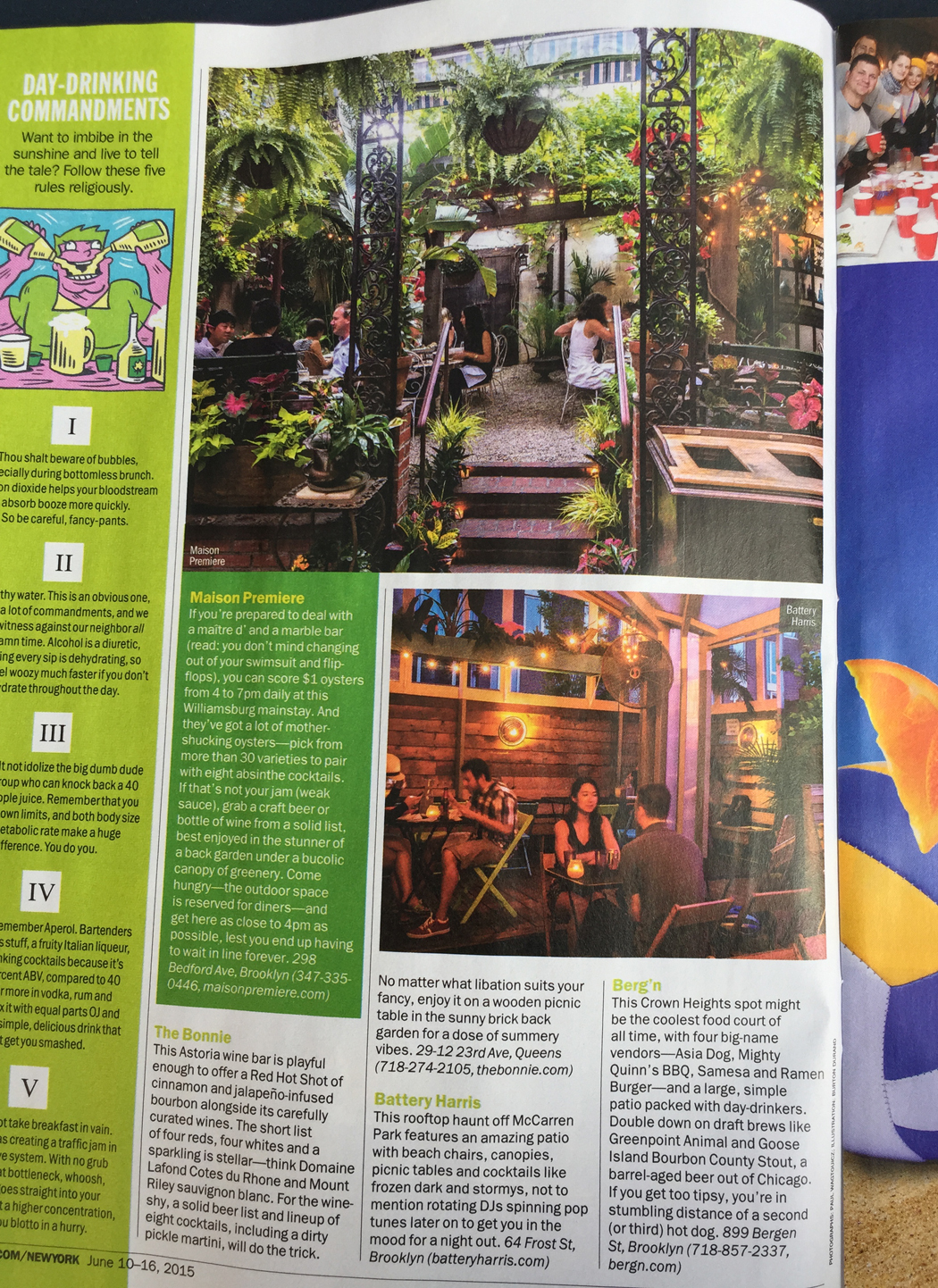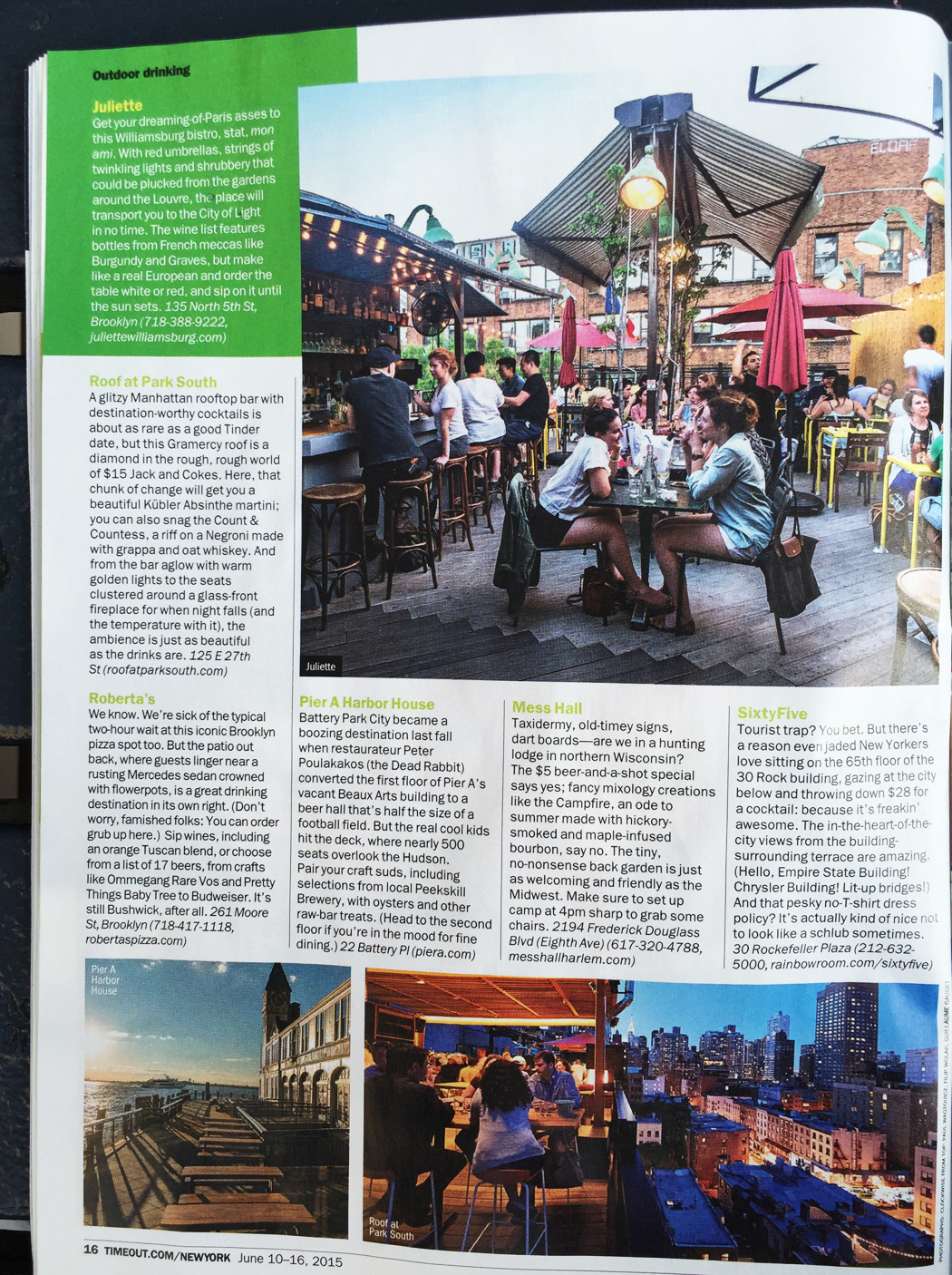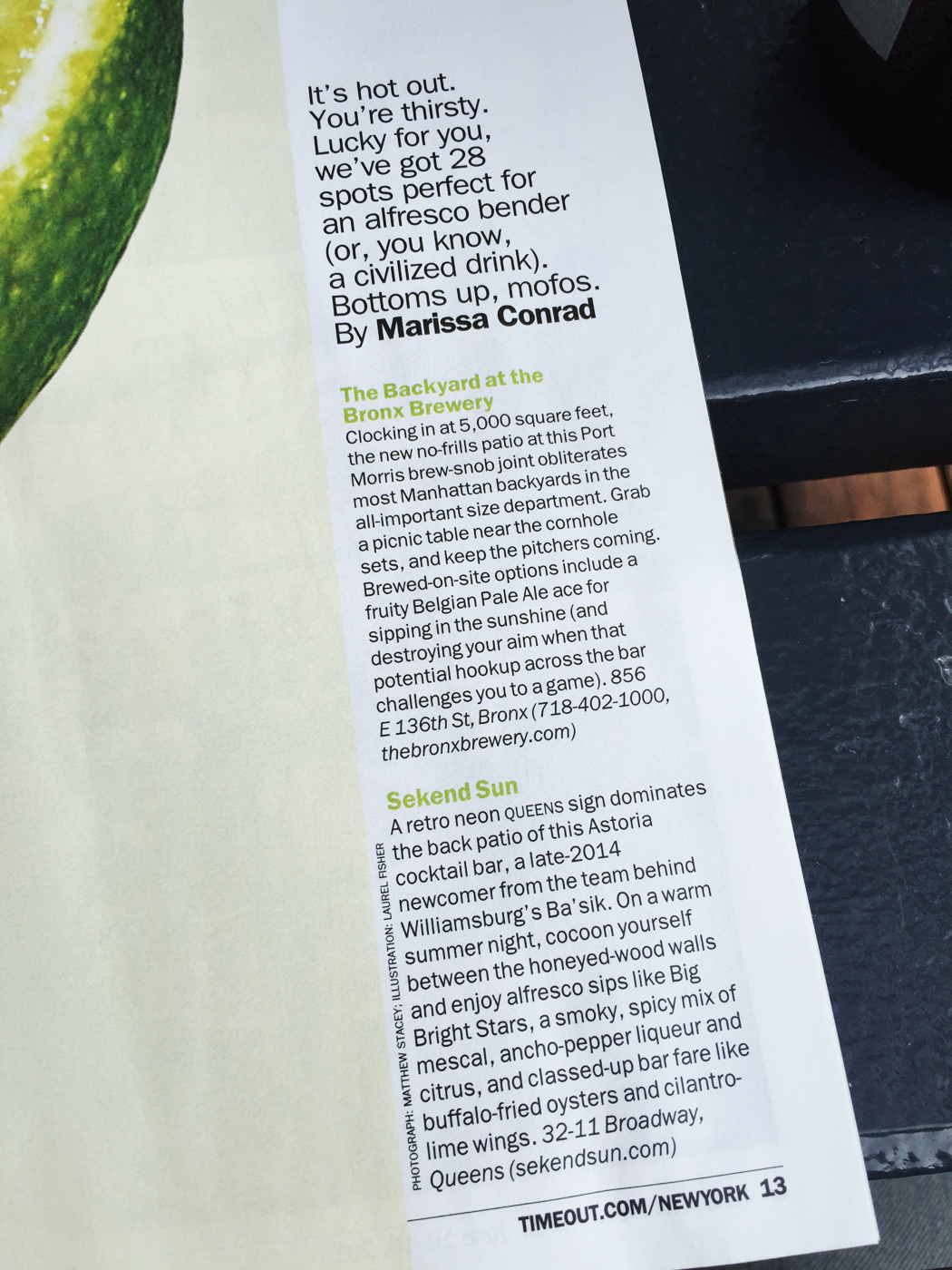 Hittade tipset i en barguide i den eminenta guidetidningen Time Out New York (här finns fler New York-sommartips från Time Out). Inom journalistik är termen ”rewrite” en vitt utbredd term, helt enkelt att man gör en egen artikel baserad på en redan publicerad artikel. Det tar dock lite tid, så jag plåtade istället helt sonika av Time Outs bartips så att du, bästa läsare, ska kunna ta del av härligheten. Öppna galleriet nedan genom att klicka på en bild.