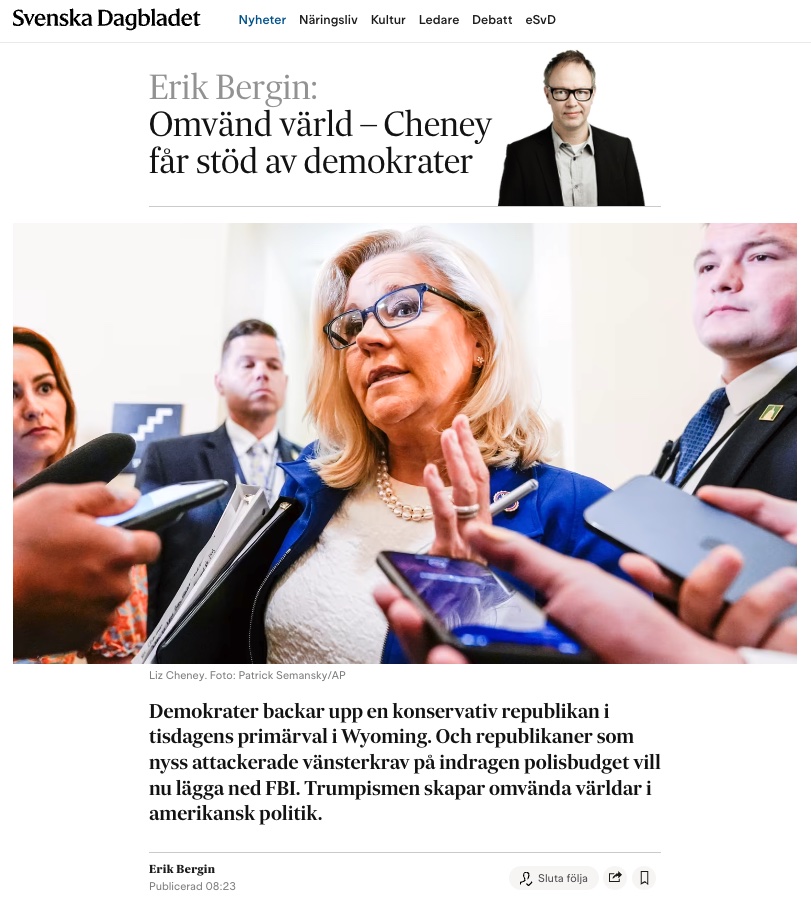 Läs min analys i SvD om den bakvända världen i amerikansk politik, där vissa demokrater inför tisdagens primärval i Wyoming valde att stödja den konservativa politikern Liz Cheney, i ett försök att rädda henne undan hennes eget Trump-styrda partis försök att få bort henne.