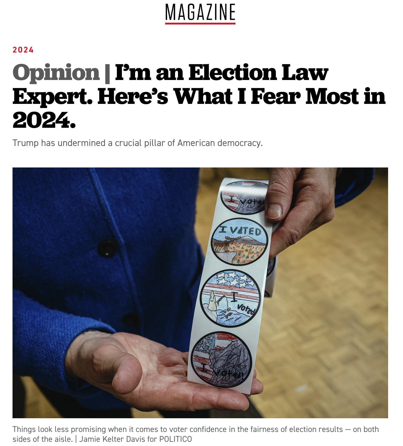 BRA LÄSNING — Politico har en text av Richard Hasen, professor vid UCLA och valexpert som ”ägnat 30 år” åt att stärka amerikanska vallagar. Han skriver att han var mer nervös för sammanbrott i de demokratiska institutionerna inför 2020 än han är nu.