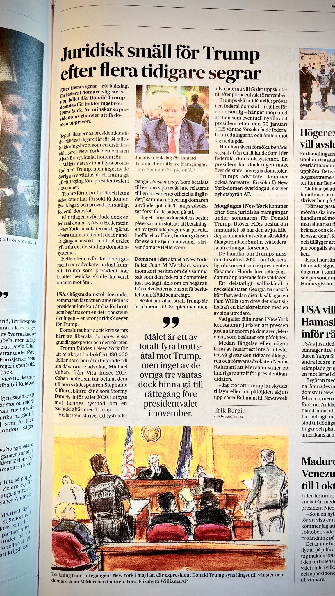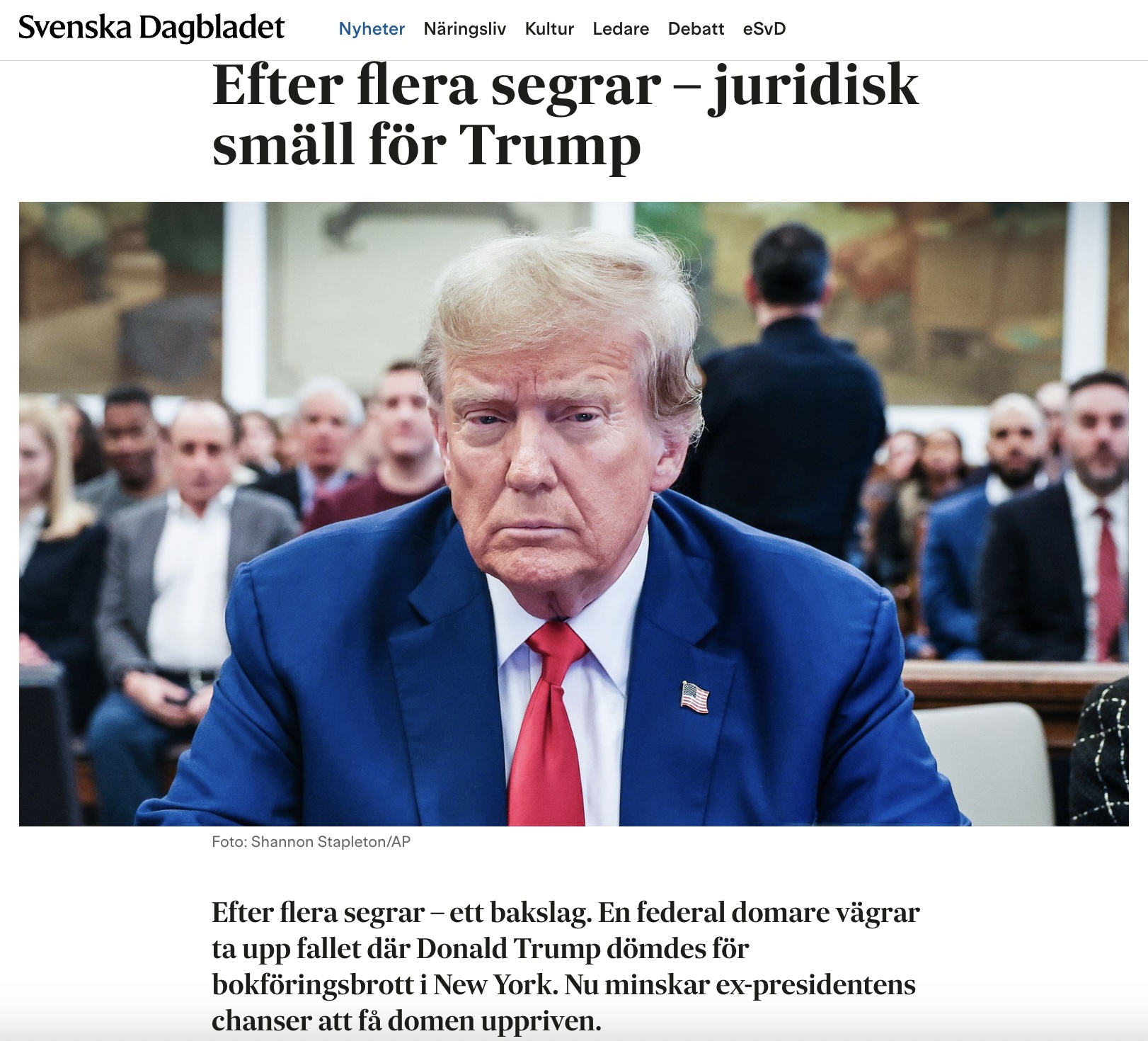 Donald J. Trump åker på ett juridiskt bakslag när en federal, statlig domare avfärdar begäran från Trumps advokater om att få den delstatliga fällningen för 34 fall av bokföringsbrott i New York prövad.