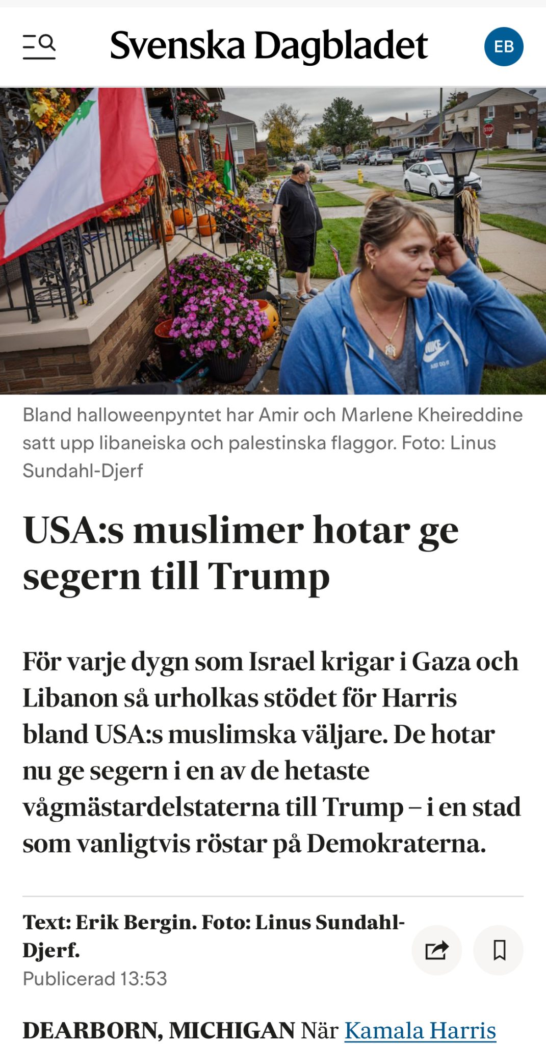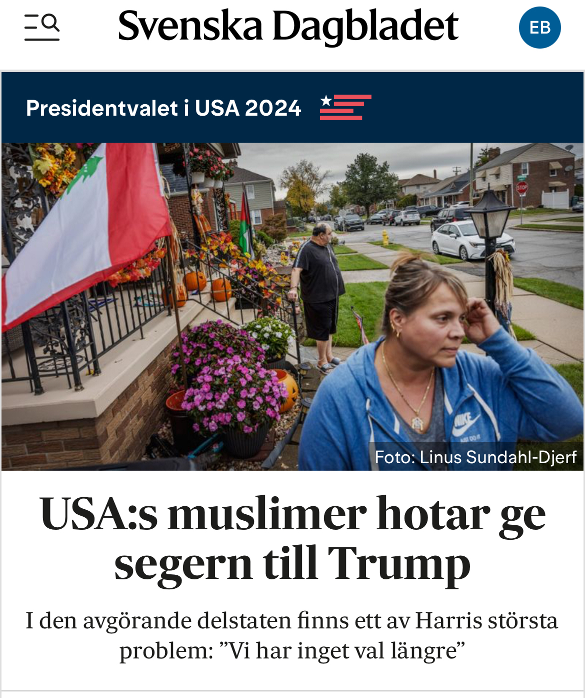 USA:s största koncentration av muslimer bor i Dearborn, precis väster om Detroit, Michigan. De har historiskt röstat på Demokraterna. De säger nu att de inte kan stödja Kamala Harris, eftersom de betraktar henne som delaktig i Bidenadministrationens Israelvänliga politik.