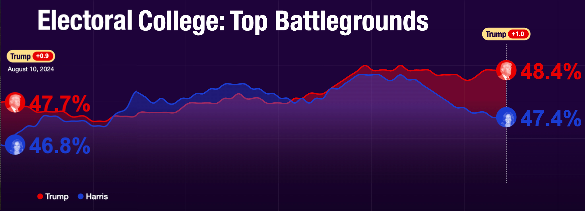 Så här har det sett ut sedan augusti, mätt som en sammanvägning av de sju batleground states enligt Real Clear Pollings genomsnitt: