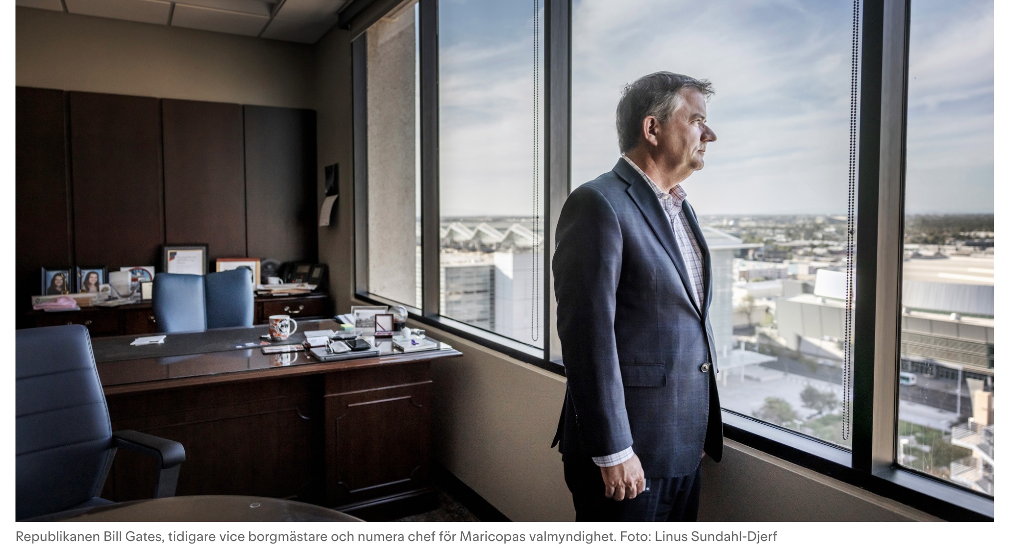 Några mil söderut sitter republikanen Bill Gates, chef för valmyndigheten i Maricopa County, och är orolig. Maricopa County översvämmades av Trumpanhängare 2020 som trodde på Trumps lögn om att Demokraterna på något vis fuskat bort segern i Maricopa och gett den till Joe Biden.