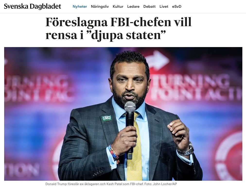 Jag rapporterar i SvD om att Trump föreslår kontroversiella juristen Kash Patel som FBI-chef.