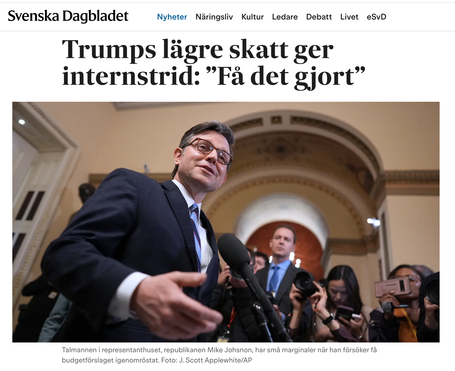 Amerikanska talmannen, republikanen Mike Johnson, är i hård kamp med sina egna partikamrater i representanthuset om mega-förslaget till ny budget, döpt till ”One Big Beautiful Bill” som han lovat presidenten att leverera i maj.